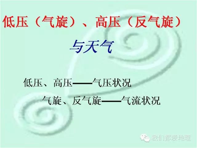 1.了解气团(冷气团、暖气团)的概念;理解锋的概念与分类;理解低压(气旋)、高压(反气旋)、高压脊、低压槽的概念。