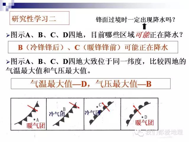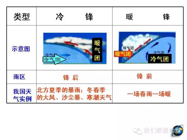 1.冷锋与暖锋的判断,理解冷锋天气与暖锋天气。