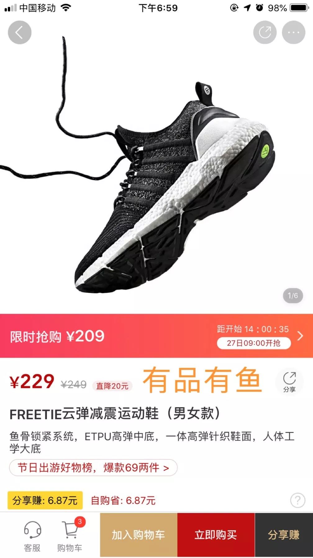 3.有品有鱼,小米旗下的社交电商,它不仅有优惠券可以领,并且自买分享都有佣金,其特点就是相比以上两款app的同款产品更具价格优势,而且可以进行推广,裂变团队。这款鞋领劵减去返利价格为222元。