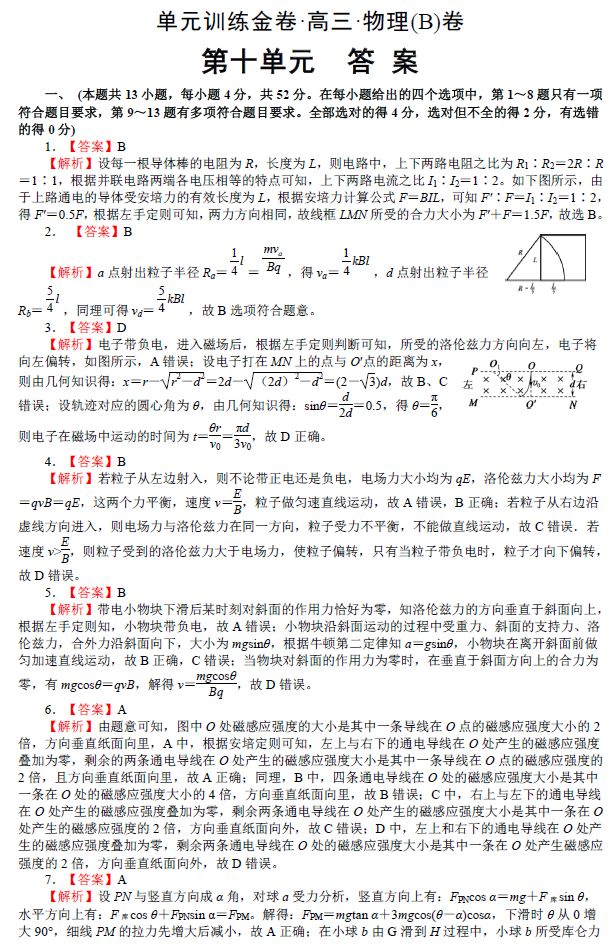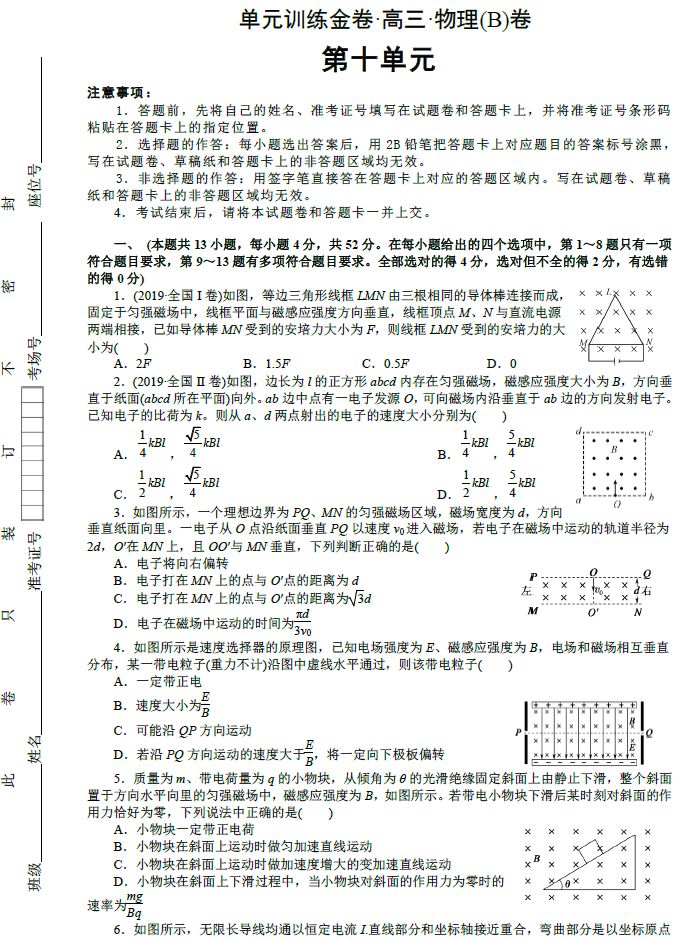 备战2020年高考高三一轮单元训练金卷 物理 第十单元 磁场 B卷 Word版含答案