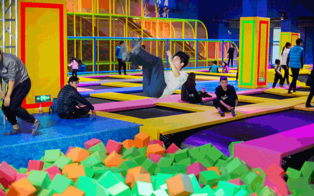 为了能让小孩子们也可以愉快的玩耍,下面都有一个泡沫方块池或者一个超大的气垫蹦床。就算是坚持不住掉下来,也完全不用害怕。