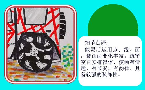 作品点评:黄翊轩的这幅是一幅非常优秀的作品,通过半写生半创作的方式,想象计出属于自己的越野车。从画面中可以看出在越野车形体的表达上或夸张或变形或提炼使得画画有特别的韵律、节奏感,同时画面中的黑白灰三个色阶变化丰富,车身上的线条虚实错落有致、疏密排列得体。