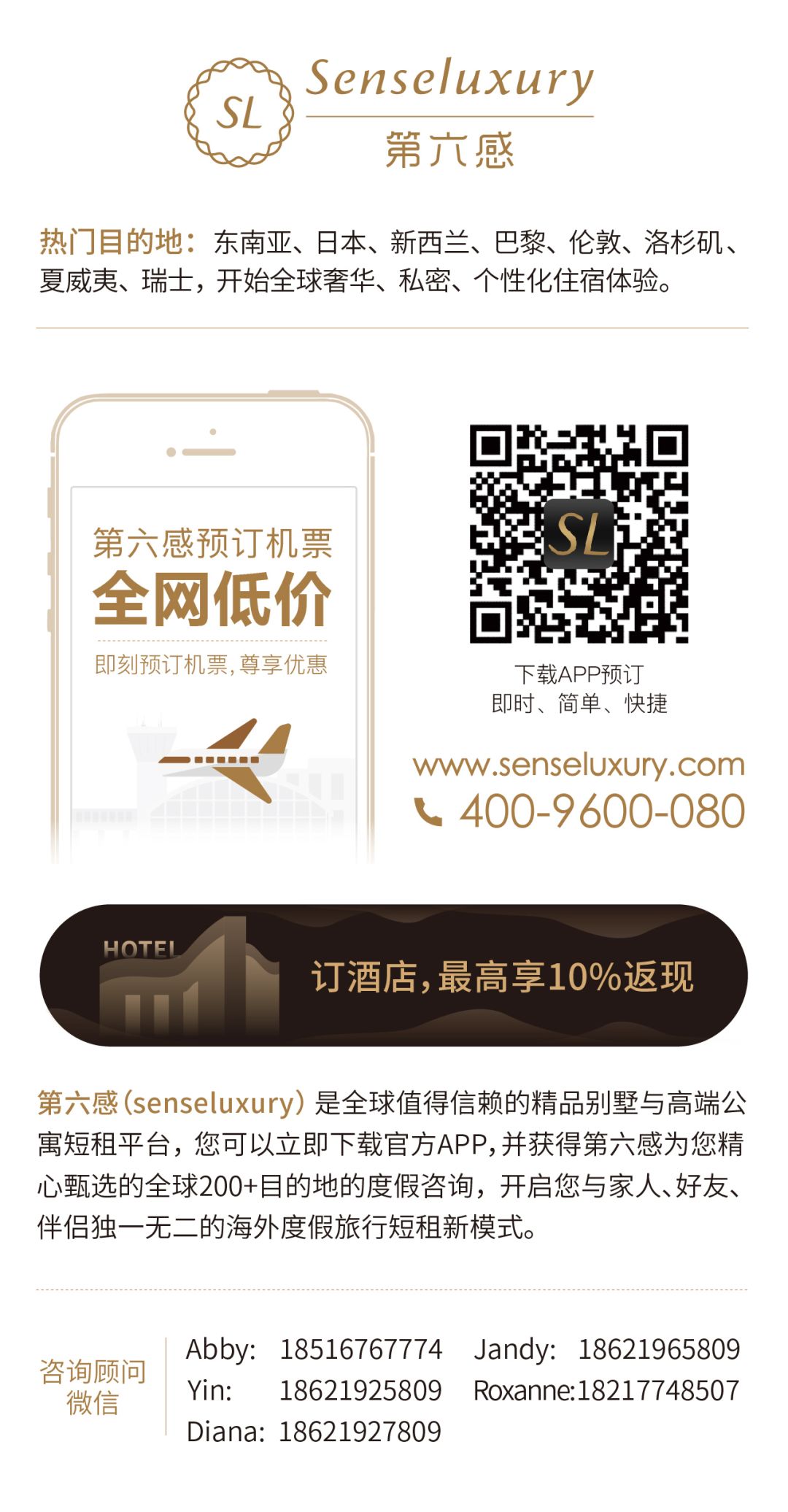 【版权声明】1、凡注明来源为第六感、或者印有第六感LOGO的图片和视音频文件,版权均属于第六感别墅度假,未经授权不得转载和使用,如需转载或使用,请提前联系我们;2、部分图片和视音频来源于网络公开素材,本号仅用于学习和交流,如有侵权,请及时联系,我们将第一时间进行删除。3、联系电话400-9600-080 或者致信邮箱:marketing@senseluxury.com
