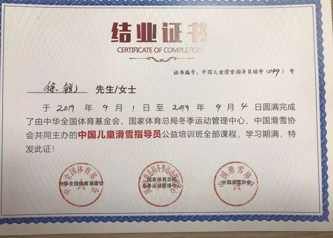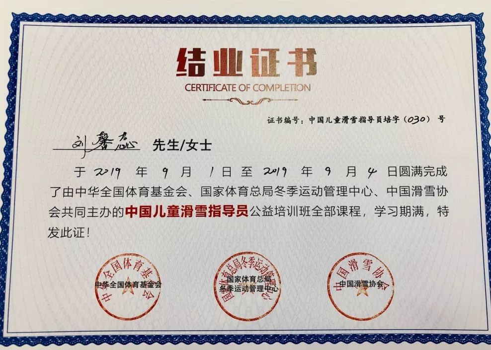 1.北京市滑雪协会认证的高山滑雪结业证书