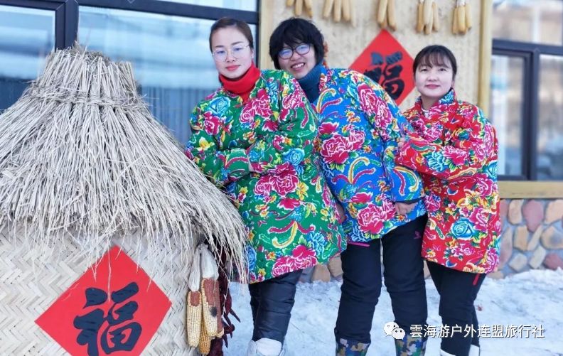 体验东北农家大炕,坐在炕头上唠嗑,穿东北花棉袄照相,坐东北马拉爬犁。