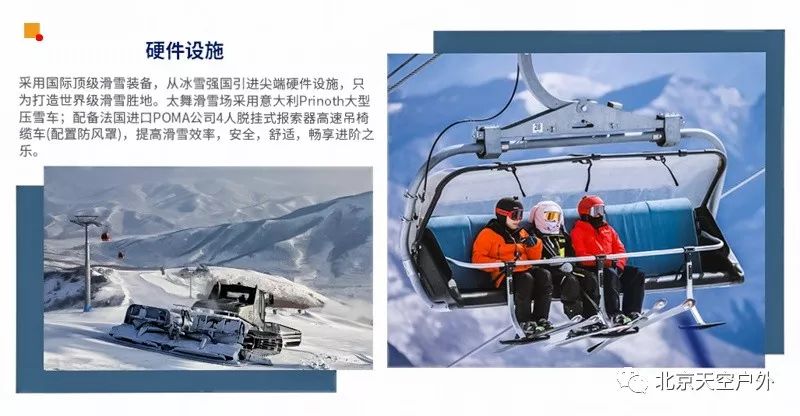 造雪面积达15公顷,独立的区域划分,更好地保障滑行安全,让其安全进阶。配备法国进口POMA公司4人脱挂式抱索器高速吊椅缆车(配置防风罩),提高滑雪效率,畅享进阶之乐。