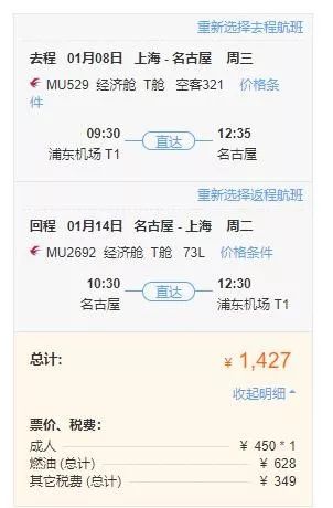 上海往返名古屋1月班期只要1.4K,这个班期刚好包含了第一波白川乡点灯活动。