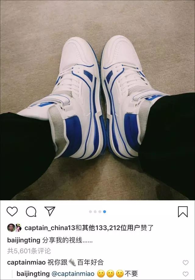 前几天他上脚了一双 Louis Vuitton Trainer 并且美滋滋的拍了照发了 Instagram。在留言回复中,我们发现了倪妮,祝他和球鞋百年好合,他还倔强回复了 “/难过 /难过 /难过 不要”。