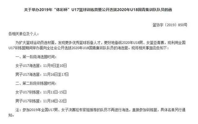 北京时间10月27日,中国篮球协会发布一条通告,内容为《关于举办2019年“体彩杯”U17篮球训练营暨公开选拔2020年U18国青集训队队员的函》。通告针对各相关单位及个人,称“为扩大篮球运动员选材面,发现更多优秀篮球后备人才,更好地备战2020年U18男、女篮亚青赛,现利用全国U17训练营期间举办面向全社会公开选拔2020年U18国青集训队队员的海选营。”